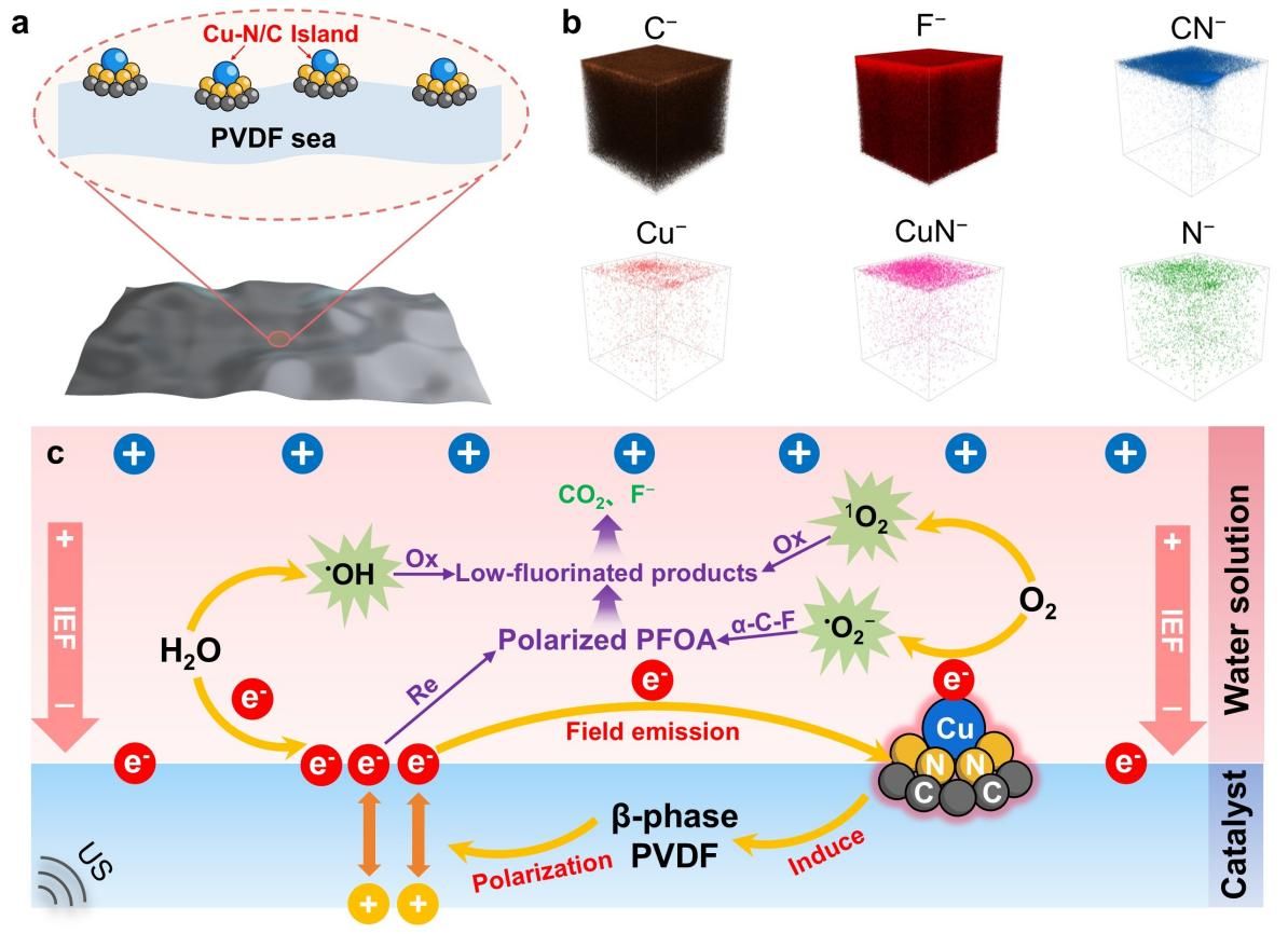 研究发现,通过在聚偏氟乙烯(PVDF)基质中嵌入原子级分散的Cu-N4位点,能够触发界面电子转移并诱导PVDF的β相结晶,从而显著增强压电极化和界面电场(IEFs)。这种独特的配置通过场发射效应驱动电子从PVDF基质定向注入Cu-N4活性中心。富电子的铜位点能够活化溶解氧生成•O2−,通过亲核攻击诱导C-F键极化并断裂。随后,系统产生的•OH和1O2协同作用,将低氟中间体彻底氧化矿化,构建了高效的级联还原-氧化路径。