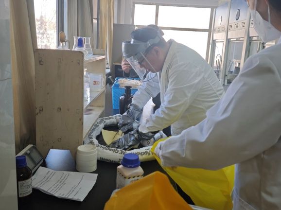 在学院党委书记于龙泉的指挥下,演练正式开始。逸夫楼B405实验室操作人员不慎碰倒硫酸试剂瓶,造成硫酸四处泄漏,皮肤和衣物上都有沾染。泄漏的硫酸溅到实验人员的手上和衣服上,存在人员灼伤中毒风险,并可能进一步污染外部环境。实验人员大声呼救并尝试初期处置,实验指导教师郑鲁沂、杨小凤立即指导演习学生脱掉沾染污染物的实验服,防止造成二次污染,并用大量的清水冲洗皮肤上的硫酸,使用2%到5%的碳酸氢钠溶液进行初步中和处理;同时联系于龙泉书记和分管副院长张彦。张彦迅速通知应急处置人员赵阳老师和基础化学实验中心张卫民老师赶往现场处置。赵老师戴好护目镜,手上佩戴PE手套,穿上质地较厚的实验隔离服,使用吸附剂吸附溅射出的硫酸,用吸附棉吸附初步处理过的危化品废弃物,采用吸附棉围挡洒出的硫酸,防止污染物扩散,造成其他次生危害;随后,他使用弱碱吸附剂吸附硫酸后,使之成为固体废弃物,用吸附棉和小簸箕收集污染物,使用废弃物收集袋收集后等待废弃物处置公司后期处置。