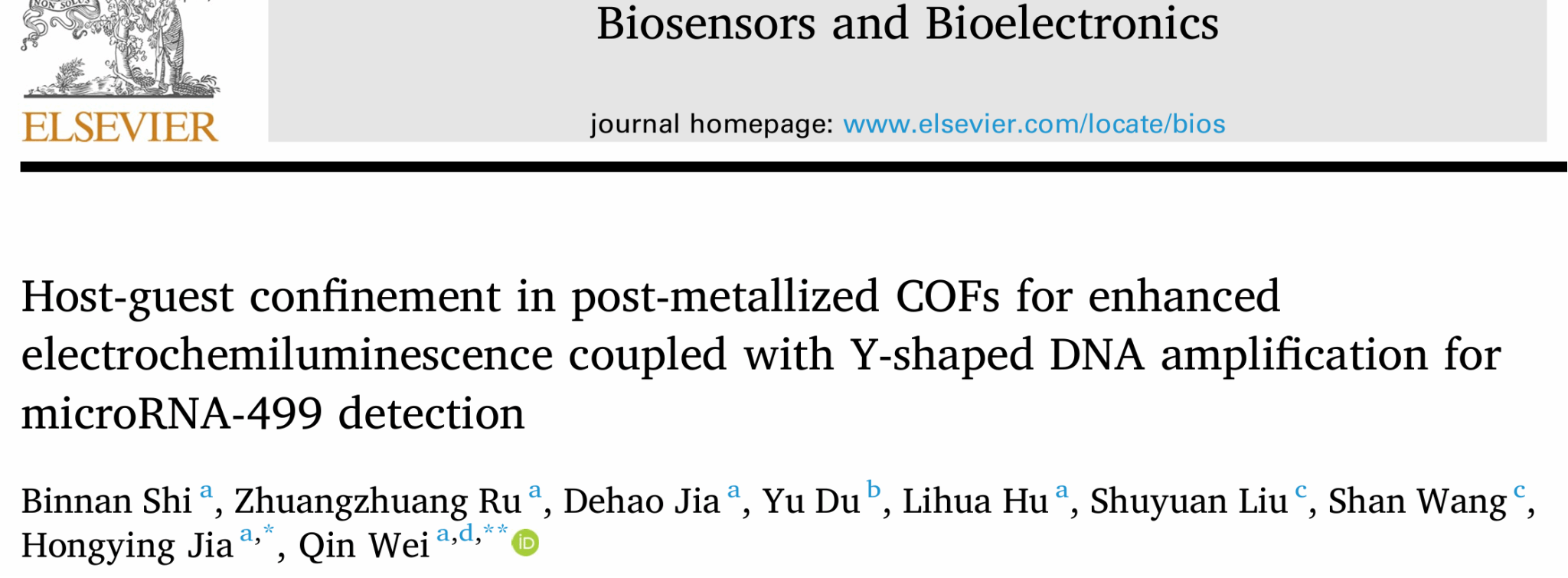 近日,我院魏琴课题组在权威期刊《Biosensors and Bioelectronics》上发表了题为“Host-guest confinement in post-metallized COFs for enhanced electrochemiluminescence coupled with Y-shaped DNA amplification for microRNA-499 detection”的研究论文。