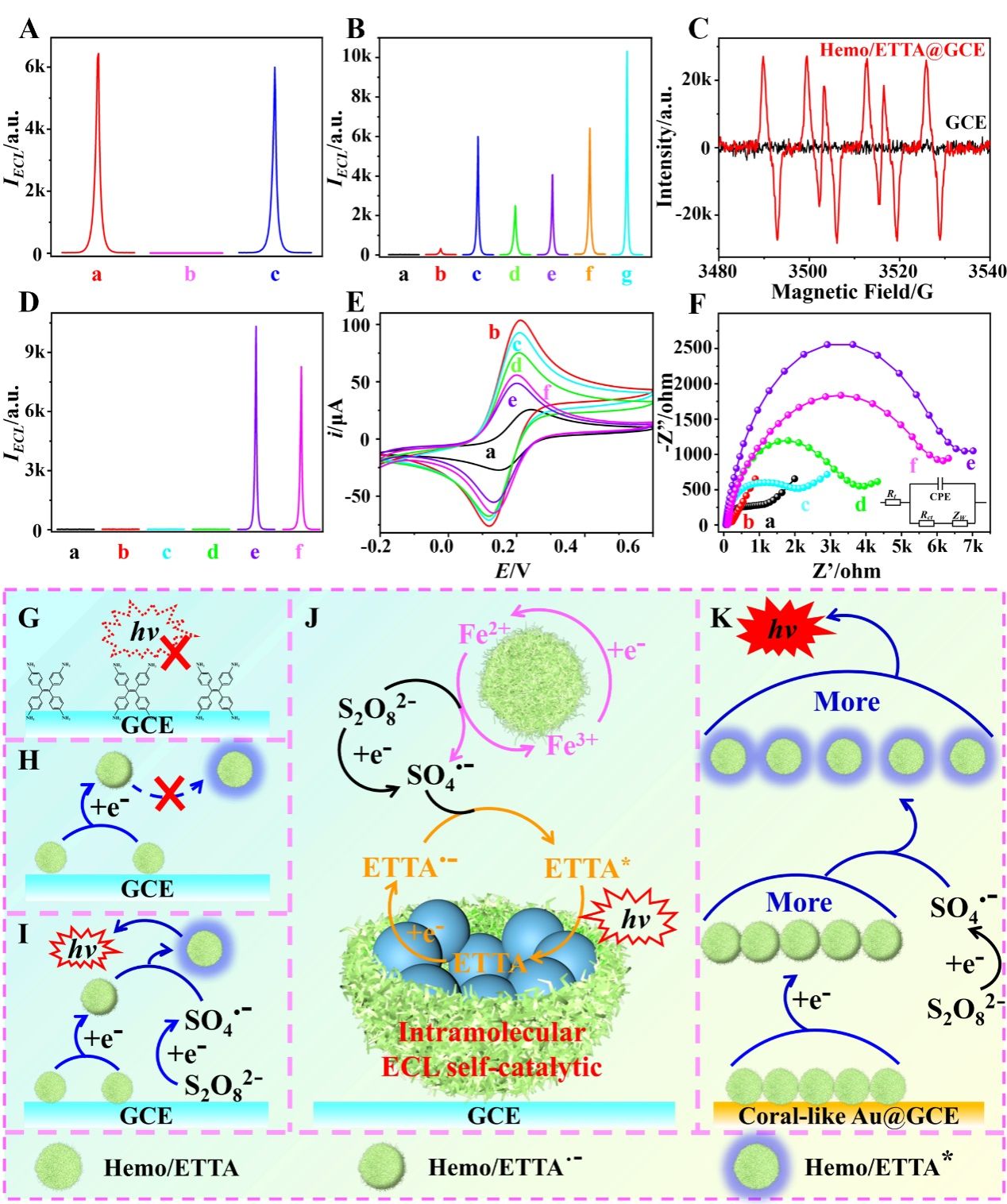 研究发现,Hemo不仅可以作为纳米限域的载体,还可以通过自带的Fe2+作为自催化剂直接参与氧化还原反应。这有效缩短了电子的转移路径,进一步增强纳米限域诱导的AIECL效应。