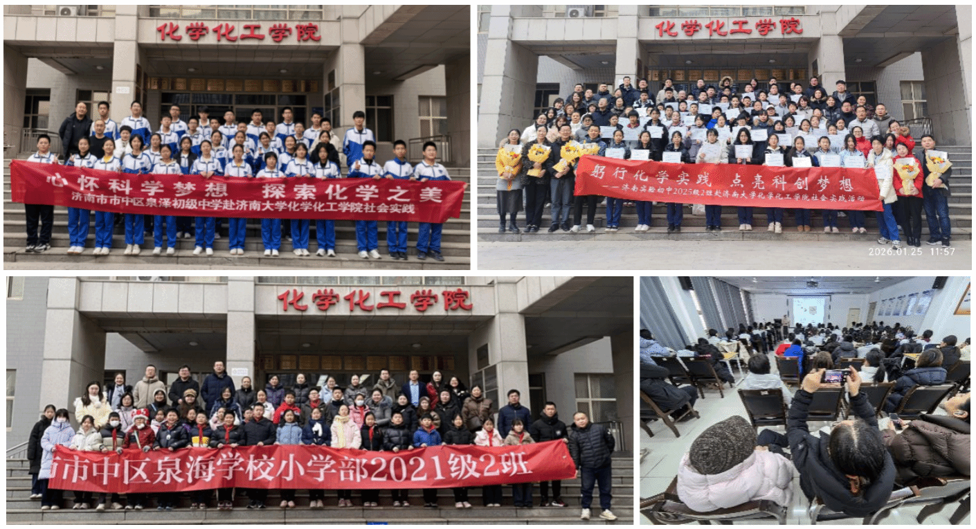 为弘扬科学精神,普及化学知识,激发青少年科技创新热情,近日,由济南大学化学化工学院、山东省应用化学科普教育基地、山东省化学材料前沿科普工作室、山东省化学与健康科普工作室联合开展的“躬行化学实践,点亮科创梦想”等系列科普教育和社会实践活动在济南大学顺利举行。济南市实验初级中学、济南市市中区泉泽初级中学、济南市市中区泉海学校小学等学校300余名师生、家长走进高校实验室与科普基地,在沉浸式体验中感受化学魅力,播撒科创种子。